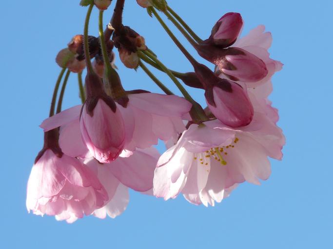 Keywords: ornamental cherry flowering twig bud flowers pink japanese cherry trees cherry blossom blossom bloom road spring sky ornamental plant