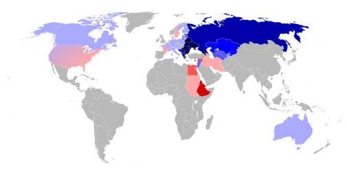 Keywords: Orthodoxy by Country.svg Distribution of Orthodox Christianity in the world by country Eastern Orthodoxy legend 000055 Main religion more than 75 0000aa Main religion 50 - 75 0000ff Important minority religion 20 - 50 5555ff Important minority religion 5 - 20 aaaaff Minority religion 1 - 5 Oriental Orthodoxy 550000 Main religion more than 75 d40000 Main religion 50 - 75 ff0000 Important minority religion 20 - 50 ff5555 Important minority religion 5 - 20 ffaaaa Minority religion 1 - 5 Transferred from http //en wikipedia org en wikipedia; transferred to Commons by User Rafy using http //tools wikimedia de/~magnus/commonshelper php CommonsHelper <br/> Original text I <span style color 000066; padding 3px; >λ τερ ιξ</span><sup style color 666666; >talk</sup> created this work entirely by myself 01 15 23 December 2010 UTC <br/> 2010 12 23 first version ; 2010 12 23 last version <span style color 000066; padding 3px; >λ τερ ιξ</span><sup style color 666666; >talk</sup> Original uploader was Lanternix at http //en wikipedia org en wikipedia CC-ZERO Lanternix at http //en wikipedia org en wikipedia Cc-zero Original upload log page en wikipedia Orthodoxy_by_Country svg 2010-12-23 02 51 Lanternix 1376660 65002 bytes <nowiki></nowiki> 2010-12-23 02 50 Lanternix 1350625 1735 bytes <nowiki></nowiki> 2010-12-23 01 15 Lanternix 1350625 46486 bytes <nowiki> I ~~~ created this work entirely by myself ~~~~~ ~~~ </nowiki> ImageNote 1 966 284 14 16 1410 715 2 Oriental Orthodoxy is very old in India Many Oriental Orthodoxy Churches exist in Indian state of Kerala However they represent less than 1 of the total population of India so they are not marked on this map ImageNoteEnd 1 help I want to add India as oriental orthodox Christian as there are many Oriental orthodox in India specially in the Indian state of Kerala They are less than 1 of the population of India - 0 4 to be precise So they should not be added unless we change the official parameters of the map so that countries with less than 1 Orthodox Christians are also marked a change that would also affect other countries besides India Eastern Orthodox Church maps Christian distribution maps of the world Maps needing South Sudan political boundaries |