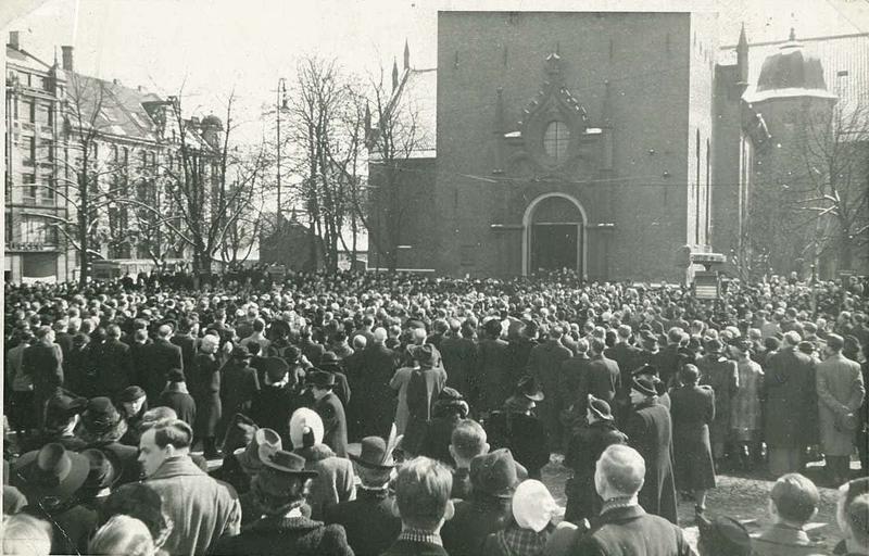 Keywords: kirke oslo norway protest krig war hird publikum gudstejeste riksarkivet crowd people outdoor Beskrivelse: Langfredag 3. april 1942 utenfor domkirken i Oslo. Et tusentalls mennesker hadde møtt opp for å høre gudstjenesten til den avsatte biskop Eivind Berggrav. Imidlertid var biskopen nektet å forrette og arrestert av myndighetene. I protest sang folk ”Gud signe vårt dyre fedreland” og ”Ja vi elsker” utenfor kirken. Hird og politi forsøkte forgjeves å spre mengden. Fotograf: Ukjent Arkivreferanse: Riksarkivet, PA-1209 NTBs krigsarkiv/Ue/L0099/Livet i Norge under okkupasjonen Good Friday April 3rd 1942 outside Oslo Domkirke. Around a thousand people had come to listen to the sermon of the dismissed bishop. However, the bishop was refused to conduct and arrested by the authorities. To protest, people sang”Gud signe vårt dyre fedreland” and ”Ja vi elsker”, outside the church. NS political troops and the police tried in vain to spread the crowd. Photographer: Unknown Archival reference: Riksarkivet, PA-1209 NTBs krigsarkiv/Ue/L0099/Livet i Norge under okkupasjonen Url: www.arkivverket.no/arkivverket/Tema/Andre-verdenskrig-i-N... Beskrivelse: Langfredag 3. april 1942 utenfor domkirken i Oslo. Et tusentalls mennesker hadde møtt opp for å høre gudstjenesten til den avsatte biskop Eivind Berggrav. Imidlertid var biskopen nektet å forrette og arrestert av myndighetene. I protest sang folk ”Gud signe vårt dyre fedreland” og ”Ja vi elsker” utenfor kirken. Hird og politi forsøkte forgjeves å spre mengden. Fotograf: Ukjent Arkivreferanse: Riksarkivet, PA-1209 NTBs krigsarkiv/Ue/L0099/Livet i Norge under okkupasjonen Good Friday April 3rd 1942 outside Oslo Domkirke. Around a thousand people had come to listen to the sermon of the dismissed bishop. However, the bishop was refused to conduct and arrested by the authorities. To protest, people sang”Gud signe vårt dyre fedreland” and ”Ja vi elsker”, outside the church. NS political troops and the police tried in vain to spread the crowd. Photographer: Unknown Archival reference: Riksarkivet, PA-1209 NTBs krigsarkiv/Ue/L0099/Livet i Norge under okkupasjonen Url: www.arkivverket.no/arkivverket/Tema/Andre-verdenskrig-i-N... |