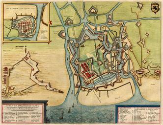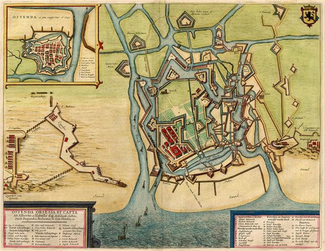 Keywords: Ostenda obsessa et capta.jpg Ostenda obsessa et capta Mapa de la ciudad de Ostende durante el sitio de 1601 - 1604; el norte en la parte inferior Obra de Joan Blaeu hacia 1649 grabado de 37 x 49 cm Abajo el Mar del Norte En el centro en rojo los edificios de la ciudad vieja junto al puerto separada de la parte nueva en verde por un canal El canal que aparece a la izquierda de la ciudad es el Geule por donde los barcos circulaban hacia el puerto El canal de la derecha es el Old Haven Entre éste y la ciudad un sistema de esclusas marrón controlaban el flujo de agua hacia los fosos Alrededor de la ciudad en la parte exterior del canal que la rodea las construcciones poligonales con el vértice hacia el exterior son los baluartes holandeses En la parte izquierda de la imagen aparece el cuartel de los tercios bajo el mando del conde de Bucquoy; la construcción en línea quebrada es el dique levantado por éstos para servir de soporte a la artillería que intentaba impedir el tráfico de barcos hacia la ciudad El terreno sobre el que se asentaba era inundado en la pleamar Al oeste derecha con los vértices hacia la ciudad las líneas del archiduque Alberto de Austria En el cuadrante superior izquierdo vista de la ciudad con el norte arriba Mapa del sitio de Ostende de 1601 - 1604 http //www sanderusmaps com/antique-maps/europe/oostende_4340 cfm 1649 creator Joan Blaeu PD-old-100 Maps by Willem and Johannes Blaeu 1649 Old maps of Ostend Military history of Spain Siege of Ostend