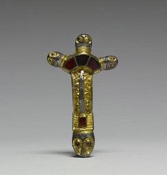 Keywords: Ostrogothic - Crossbow Fibula - Walters 57665.jpg This crossbow fibula was found together with a buckle Walters 57 664 and some glass beads in 1876 at Nagy-Várad Hungary Oradea Romania It is decorated with garnet settings cast S-shaped scrolls and banding and four animal headed terminals the largest with garnet inlaid eyes century 5 Early Medieval silver gilt with garnets and glass paste cm 6 5 3 8 1 7 accession number 57 665 17586 Found in Nagy-Várad Grosswardein Hungary now Oradea Romania 1876 A Bolonyi Jr date and mode of acquisition unknown Nagy-Várad Museum Oradea Romania c 1876 by gift Henry Walters Baltimore by purchase Walters Art Museum Henry Walters Acquired by Henry Walters Early Christian and Byzantine Art Baltimore Museum of Art Baltimore 1947 Romans and Barbarians Museum of Fine Arts Boston Boston 1976-1977 Jewelry - Ancient to Modern The Walters Art Gallery Baltimore 1979-1980 place of origin Georgia country Walters Art Museum license Medieval metalwork in the Walters Art Museum Jewellery in the Walters Art Museum Ostrogothic jewellery Media contributed by the Walters Art Museum needs category review Oradea Romania in the 5th century Ostrogothic jewellery in Romania |