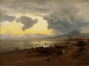 Keywords: Oswald Achenbach - Sonnenuntergang am Strand.jpg artwork Creator Oswald Achenbach oil on canvas cm 29 8 38 7 O J W Achenbach ~ lower right signature http //www sothebys com/de/auctions/ecatalogue/2007/19th-century-european-art-n08355/lot 227 lotnum html Sotheby's New York 23 Oktober 2007 lot 227 PD-old-auto-1923 1905 Paintings by Oswald Achenbach Oil paintings of seascapes Landscape paintings of Italy Naples 19th-century landscape paintings Images from Sotheby's |