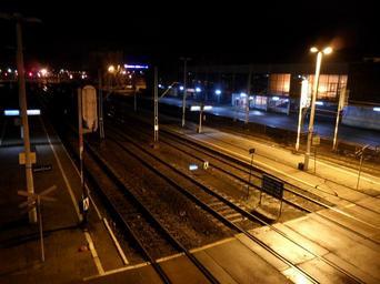 Keywords: Oświęcim PKP.JPG pl Stacja kolejowa w Oświęcimiu nocą Widok z kładki nad torami own Olos88 2012-02-25 Oświęcim train station Cc-zero