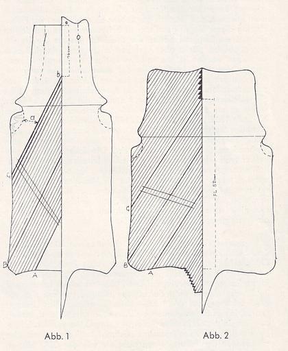 | Keywords: Otter-Mantel-Verarbeitung 1-2 - Auslassschnitte + Rückentfernung.jpg Ottermantel-Verarbeitung Der Ottermantel Die schönen und strapazierfähigen Otterfelle sind heute 1964 nicht mehr nur Privileg für Herrenschalkragen sondern haben einen festen Platz in der modischen Pelzverarbeitung für Mäntel Paletots etc erobert Dieses ist nicht allein auf die Gleichmäßigkeit und Schönheit des Materials zurückzuführen es ist vor allem auch seine Strapazierfähigkeit die wohl an erster Stelle aller Pelze überhaupt liegt Die steigende Nachfrage hat den Preis ebenfalls erheblich angezogen Zur Verarbeitung gelangen in erster Linie südamerikanische afrikanische und die etwas raucheren und schwereren virginischen Ottern Ab und zu kommen auch die wunderschön seidigen und flachen pastellfarbigen Burmaottern auf den Markt In ihrer Verarbeitung bestehen keine wesentlichen Unterschiede und bei entsprechender Akkuratesse und Sauberkeit ist Otter ein leicht zu verarbeitendes Material Man benötigt je nach Größe 12 bis 15 Stück für einen Mantel 1 Einteilung des Schnittes Mit Hilfe eines entsprechenden Durchschnittsfelles dessen Inhalt man zuzüglich Dehnung errechnet erfolgt die Streifeneinteilung des Musters Die Ärmel schneidet man 1 2 um und benötigt für beide Ärmel in der Regel zwei Felle Für Besatz und Manschetten sind auch zwei Felle vorgesehen Für den Körper stehen neun Felle zur Verfügung Das wäre ein Gesamtverbrauch von dreizehn Fellen bei einem normalen Mantelmaterial Bei der Einteilung des Schnittes ist zu empfehlen darauf zu achten daß am Armloch ” Ärmelanschluss immer Grotzen ist Dies gewährt einen einwandfreien und sauberen à bergang Ob die Ärmel hierfür quer oder längs verarbeitet werden ist weniger ausschlaggebend Des weiteren sollte an der vorderen Kante Grotzen sein dadurch erhält man mit dem Besatz eine tadellose Kante 2 Vorsortieren Das Vorsortieren ist deshalb ratsam weil man sich für die Ärmel zwei entsprechend große und rauche Felle reserviert welche zum Umschneiden breiter vorgezweckt werden müssen Abb 2 3 Anbrachen Löcher und Kahlauer werden wie üblich unter Berücksichtigung der Farbgrenzen mittels Zungen bzw Ellipsen entfernt Die Ohren werden durch kleine Ellipsen herausgenommen 4 Markieren Abb 1 Grotzen Diechen Kreuz unmittelbar oberhalb der Diechen sowie die helleren Kehlen werden genau markiert und auf die Lederseite übertragen 5 Vorzwecken Ottern haben eine dichte Lederbeschaffenheit und sollten entsprechend lange fatten Man kann sie nachher auch genügend auszwecken Beim Vorzwecken soll vor allem darauf geachtet werden daß die Felle in Höhe der Diechen Kreuz entsprechend breit gezweckt werden Beim Vorzwecken der Ärmelfelle erleichtert man sich die Arbeit des Umschneidens weitgehend wenn man die Felle so breit wie nur irgend möglich zweckt Da die Schweifwurzel hierbei gut mit ausgenutzt werden kann sollte der Schweif auch gut ausgezweckt werden Abb 2 6 Sortieren Beim Sortieren muß man sich endgültig entscheiden ob der Mantel gestürzt gegen den Strich oder normal mit dem Strich gearbeitet werden soll Bei der gestürzten Verarbeitung kommt der warme dunkle Ton des Materials richtig zur Geltung Das ganze Stück wirkt samtener dunkler raucher und eleganter man sieht aber sofort auch jede Druckstelle Krummspitzige Felle wirken oft grau Normale Verarbeitung gibt dem Ganzen durch den flacheren helleren und glänzenderen Charakter ein mehr sportlicheres Gepräge Krummspitzige Felle lassen sich leichter unterbringen Der hier beschriebene Mantel wurde normal ” mit dem Strich ” gearbeitet Wie schon erwähnt bleibt sich die schnitttechnische Seite der Verarbeitung bei beiden Möglichkeiten völlig gleich Die Form des Felles hat keinerlei Einfluss da mit entsprechenden Schnitten ein Fell in jede beliebige Form gebracht werden kann Da selten ganz einheitliche Sortimente zur Verarbeitung gelangen ist es ratsam die Felle in sich zu versetzen Man sortiert die Ottern immer im Hängen und kann so am besten die Gleichmäßigkeit kontrollieren Jedoch hüte man sich davor im Grotzen ein krummspitziges Fell an ein einwandfreies zu bringen Nach dem Auslassen gibt das einen hässlichen Streifen In den Seiten läßt sich leichter eine solche Verbindung erreichen Die Felle werden nun entsprechend nummeriert Man muss sich jetzt schon im Klaren sein wie man den Besatz arbeiten will Wird der Mantel gestürzt verarbeitet so kann man leicht das Besatzfell entsprechend mit einem gut passenden Fell verlängern Hinter den Diechen läßt sich durch eine gerade Naht eine Verbindung finden Den Rest des Felles kann man für die Manschetten verwenden Wird der Mantel mit dem Strich gearbeitet so ist der flache Kopf für den Oberkragen nicht schön Die erfolgversprechendste Möglichkeit ist wenn man den Belag normal wie einen Körperstreifen auslässt und ihn halbfellig an die Kante bringt und das Pumpfteil des Kragenfelles als Oberkragen nimmt Beim Sortieren muss nun darauf geachtet werden zwei Felle zu finden die an den entsprechenden Stellen wo Belag Revers und Oberkragen zusammenkommen eine ähnliche Haarbeschaffenheit haben Es bleibt dann gleich ob der Oberkragen mit dem Strich nach vorn gearbeitet wird; es scheitelt sich dann die hintere Kragennaht oder noch besser man arbeitet den Oberkragen mit dem Strich nach hinten und verwischt die kurze Scheitelkante zwischen Kragen und Revers mit einer kleinen Zackennaht bzw noch angebrachter mit einer polnischen Zackennaht Abb 3 a Das Kopfteil des Kragenfelles findet als Manschette Verwendung 7 Vorbereiten zum Auslassen Sämtliche Felle werden jetzt zum Auslassen bzw Umschneiden vorbereitet d h den Schnittwinkel angeben und die Schnitte aufwalzen Die Erfahrung zeigt daß man mit einem Schnittwinkel von 50° genügend Schnitte unterbringen kann Das Kopfteil ist bis zum Kreuz breit genug wir lassen nur das Teil unterhalb des Kreuzes im A-Schnitt aus Hier ist es wichtig darauf zu achten die Schnitte in Höhe der Diech
