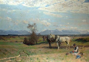Keywords: Otto Strützel Pflügender Bauer bei der Rast.jpg Pflügender Bauer bei der Rast Oil on canvas 103 x 148 cm Creator Otto Strützel Paintings of horse-drawn plows Agriculture in art Paintings of peasants Peasants in early 20th century Resting in art Plowing with horses Otto Strützel Wilhelmine Germany PD-old-auto 1930 |