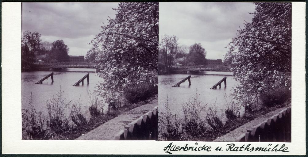 Keywords: Otto Wolff Stereoskopie, Celle, Allerbrücke und Rathsmühle, 1912, Bildseite Kopie, Blick vom Ufer der Herrenmühle in Höhe der B3-Allerbrücke über die ehemalige Hafenstraßenbrücke in Richtung Ratsmühle.jpg Bildseite der 1912 von dem Celler Fotografen Otto Wolff gefertigten Aufnahme die er vom rechten Ufer der Aller in Richtung der heutigen B3-Allerbrücke und der Ratsmühle gefertigt hat Diese handgefertigte Kopie einer Stereoskopie wurde freundlicherweise von Ilse Paul zur Verfügung gestellt um sie als Digitalisat über Wikimedia Commons nachhaltig allen Menschen zur Verfügung zu stellen Scan einer vom Original angefertigten Replik Bernd Schwabe in Hannover 2013-10-15 09 12 14 Otto Wolff <gallery> File Otto Wolff Stereoskopie Celle Allerbrücke und Rathsmühle 1912 Rückseite Kopie jpg Rückseite </gallery> PD-old Documents by Ilse Paul Otto Wolff photographer Hafenstraßenbrücke Celle Ratsmühle Celle 1912 in Lower Saxony Stereo cards of Celle |