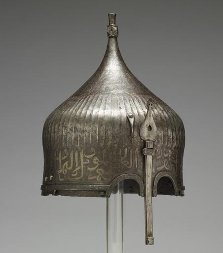 | Keywords: Ottoman or Persian - Turban Helmet with Eye Holes - Walters 5170 - Three Quarter Right.jpg A warrior would have worn this helmet over a cloth turban He would have been confident of being safeguarded in battle by the writing around the helmet's rim The inscription from the Qur'an is garbled however indicating that its Iranian maker may not have known Arabic Yet the presence of Arabic writing apparently was thought to be enough to invoke the protective power of God's word This helmet once belonged to the St Irene royal arsenal in Istanbul Turkey as it bears the distinctive mark tamga composed of a circle enclosing a loop over three vertical lines the stamp is clearly visible to the left of the nose guard on this helmet It was probably part of the war booty amassed by the Ottoman Dynasty during the many wars between Turkey and Iran Later it was owned by the French painter Jean-Léon Gérôme who traveled throughout the Near East and painted many scenes of Muslim life ca 1450 1500 late Medieval steel with silver inlay cm 38 5 23 4 h x diam accession number 51 70 6002 Armory of Constantinople Jean-Léon Gérome Collection Dikran Kelekian New York and Paris Henry Walters city Baltimore Walters Art Museum Henry Walters Acquired by Henry Walters 1913 place of origin east Turkey Ottoman or northwest Iran Persia Walters Art Museum license Islamic metalwork in the Walters Art Museum Indo-Persian armour in the Walters Art Museum Media contributed by the Walters Art Museum needs artist review 15th-century helmets Turban helmets |
