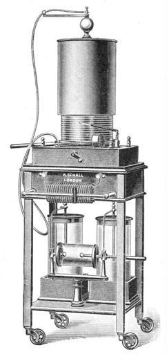 Keywords: Oudin coil Fleming.png An early Oudin coil apparatus a resonant transformer circuit similar to a Tesla coil invented by French physician Paul Marie Oudin around 1893 used in the obsolete medical field of electrotherapy during the first decades of the 20th century It generated very high voltage low current high frequency AC current 200 - 1000 kV at frequency between 200 kHz and 2 MHz The high voltage terminal at top is connected through a wire to a handheld electrode lying in front of coil which produced streamer arcs and brush discharges which were applied to the patient's body to treat various medical conditions <br/><br/> It consists of a small horizontal solenoid coil center connected to two Leyden jar capacitors to make a tuned circuit with a spark gap below enclosed in a glass tube to muffle the sound A potential of 3 - 15 kV from an induction coil separate not shown repeatedly charges the capacitors which then discharge through the spark gap and solenoid creating damped radio frequency oscillations The large resonator coil top is connected to a tap on the solenoid coil The resonator acted as a second tuned circuit; theparasitic capacitance between its ends resonates with its large inductance When the tap on the solenoid was adjusted so the primary tuned circuit and the resonator coil had the same resonant frequency large oscillating voltages were induced in the resonator due to its high Q This is an early circuit in later Oudin circuits the two coils were wound on the same axis to make a transformer J A Fleming The Principles of Electric Wave Telegraph and Telephony 2nd ed Longmans Green Co London 1910 1910 J A Fleming PD-OLD Oudin coils |