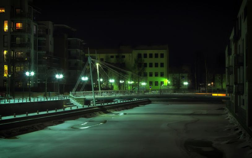 Keywords: oulu finland night evening lights lighting buildings reflections architecture pedestrian bridge frozen canal winter snow ice