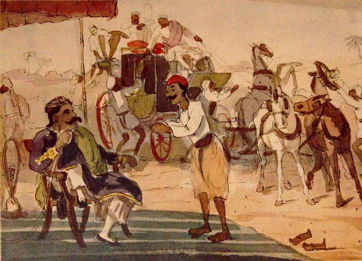 | Keywords: Ournuwab.jpg en Our Station from 'Curry and Rice on Forty Plates or The Ingredients of Social Life at Our Station in India by Captn Geo F Atkinson'; the frontispiece ; a list of the contents A series of colored prints depicting British colonial life in a small North Indian station drawn by George Franklin Atkinson 1822-1859 and published in 1858 with later reprints The images below sometimes cut off small bits of the edges of the originals Our Agriculturalists Our Ball Our Band Our Bath Our Bazar Our Bedroom Our Burra Khanah Our Cloth Merchant Our Coffee Shop Our Colonel Our Colonel's Wife Our Cook Room Our Departure for Home Our Doctor Our Doctor's Wife Our Farm Yard Our Garden Our Invalid Major Our Joint Magistrate Our Judge Our Judge's Wife Our Magistrate Our Magistrate's Wife Our Mall Our Missionary Our Moonshee Our Nuwab Our Pack of Hounds Our Padre Our Pig Sticking Our Race Course Our Sporting Griff Our Stage Coaching Our Theatricals Our Tiger-Shooting Our Travellers' Bungalow Our Wedding Source ebay Oct 2004 1822-1859 and published in 1858 with later reprints http //www columbia edu/itc/mealac/pritchett/00routesdata/1800_1899/dailylife_drawings/ourstation/ourstation html George Franklin Atkinson 1822-1859 PD-Art Uploaded with UploadWizard George Francklin Atkinson 'Curry and Rice on Forty Plates or The Ingredients of Social Life at Our Station in India' London John B Day 1858 |