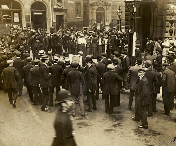 MAKE A MEME View Large Image Bow Street Magistrates' Court; manuscript inscription on reverse 'Bow Street. Crowd waiting for Mrs Pankhurst', printed 'World's Graphic Press' 7JCC/O/02/052 Photograph, printed, paper, monochrome, a crowd of men and women with large ...