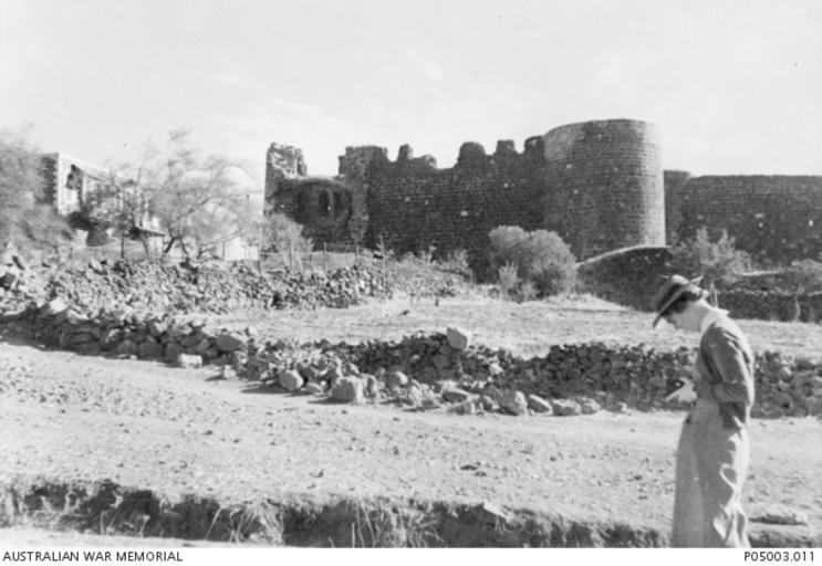 | Keywords: Outside the low stone walls surrounding the ruins of an old crusader castle. P05003.011. 1941.JPG en Outside the low stone walls surrounding the ruins of an old crusader castle VX48623 Sister Marjory Clara Calland Scoble ajusts her camera while on leave in the lakeside town of Tiberias Tiberias 1941 03 P05003 011 Rosa Hasluck PD-AustraliaGov Historical images of Tiberias Black and white photographs 1941 in Tiberias Tiberias fortress | ||||