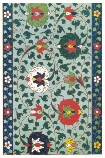 | Keywords: Owen Jones - Examples of Chinese Ornament - 1867 - plate 011.png 010 XI 11 012 The same principles which are exhibited in Plate II are to be seen in this specimen from a Bowl in cloisonné enamel The large flowers are arranged in triangles crossed by smaller flowers in the opposite direction and all connected by a continuous stem throwing off leaves and stalks to fill up the ground; all geometrically arranged and yet not in a manner so apparent as to interfere with the freedom of the composition The system of triangulation is still further kept up in the colouring On the left the purple flower is the apex of a triangle with two red flowers for a base the left one not being contained on the plate In the same way on the right of the plate the light-green flower is the apex of a triangle with two dark-green flowers at the base The white flower is the centre of the composition and stands alone and yet its centre lies between two small red flowers which form the base of a triangle having a green flower for the apex Aristeas Archival version Owen Jones - Examples of Chinese Ornament - 1867 - plate 011 - 300ppi jpg PNG PD-old-100-1923 Cloisonné of China Metal bowls Floral patterns Floral designs in China |