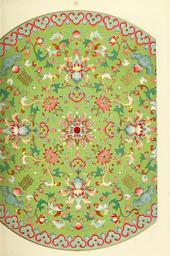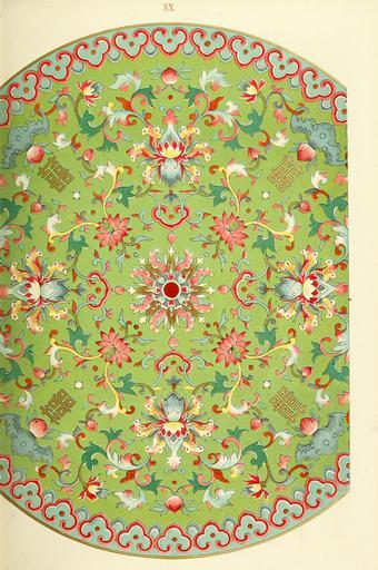 Keywords: Owen Jones - Examples of Chinese Ornament - 1867 - plate 020.png 019 XX 20 021 The same observations will apply to this plate which is taken from a painted china Dish Although all the groups are united they do not as in the finer examples we have examined proceed from one centre In this example also the pattern is indented showing that probably some mechanical means were employed to produce it; whilst on such Vases as Plates II III and V they were freely drawn by the hand without any mechanical aid PD-old-100-1923 Floral designs in China |