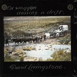 Keywords: Ox-wagon Crossing Water, Africa, ca.1875-ca.1940 (imp-cswc-GB-237-CSWC47-LS16-027).jpg en <br> Ox-wagon Crossing Water Africa ca 1875-ca 1940 Photograph of an ox-wagon similar to the type that would have been used as transport by the Scottish missionary David Livingstone The wagon which is being driven by a number of oxen or cattle can be seen crossing a stream or a river The ox-wagon became David Livingstone and his familyas home on two extended journeys in 1850 and 1851 ; This belongs to a series of Church of Scotland Foreign Missions Committee lantern slides relating to David Livingstone 1813-1873 the Scottish missionary who was best known as an explorer of Africa and anti-slavery campaigner Livingstone was born in Blantyre Scotland and after working in the local cotton mill from the age of 10 he went on to study medicine and theology in Glasgow in 1836 Having decided to become a missionary he was posted to southern Africa in 1841 In 1845 he married Mary Moffat During his life Livingstone carried out exploration of southern eastern and central Africa he discovered and named the Victoria Falls and it was his meeting with H M Stanley during a search for the source of the Nile that gave rise to the popular quotation Dr Livingstone I presume David Livingstone died in Africa on 1 May 1873 and his body was buried in Westminster Abbey Photographer Unknown Subject personal name Livingstone David 1813-1873 Filename imp-cswc-GB-237-CSWC47-LS16-027 tif Coverage date circa 1875/1940 Part of collection International Mission Photography Archive ca 1860-ca 1960 Type images Part of subcollection Photographs from the Centre for the Study of World Christianity University of Edinburgh U K ca 1900-ca 1940s Repository name Centre for the Study of World Christianity Archival file impaunpub_Volume7/1860 url Repository address The University of Edinburgh School of Divinity New College Mound Place Edinburgh EH1 2LX United Kingdom Format aacr2 1 lantern slide 8 x 8 cm Geographic subject continent Africa Rights Contact the repository for details Part of series David Livingstone LS16 Repository email divinity-CSWC ed ac uk Subject lcsh Keyword Transportation; Livestock Date created circa 1875/1940 Publisher of the digital version University of Southern California Libraries Subject aat genre distant views Format aat lantern slides Legacy record ID impa-m69440 Access conditions http //www ed ac uk/schools-departments/divinity/research/centres/world-christianity/collections-resources File GB 237 CSWC47/LS16/27 circa 1875 /1940 author http //digitallibrary usc edu/cdm/ref/collection/p15799coll123/id/64976 PD-old-70-1923 Images from USC Digital Library uploaded by Fæ International Mission Photography Archive ca 1860-ca 1960 Ox-drawn wagons in South Africa Fords in South Africa Lantern slides of South Africa Magic lantern images Animal-drawn vehicles fording