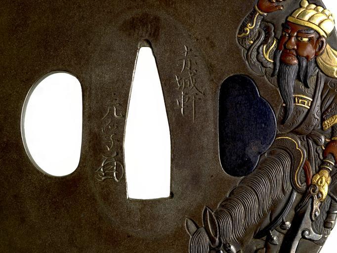 | Keywords: Oyama Motozane I - Tsuba with the Chinese General Kanyu on His Horse - Walters 51180 - Mark.jpg The mounted figure along the right edge of this tsuba is 2nd-century Chinese general Kanyu Ch Guan Yu Kuan Yu Stories of his activities during the Three Kingdoms period are told in the 14th-century novel Romance of the Three Kingdoms He is recognizable by his long black beard He was sometimes called Lord of the Splendid Black Beard On the reverse of the tsuba is the back of his horse and a pine tree between 1741 1830 Edo shibuichi copper gold silver shakudo cm 7 15 6 68 0 39 accession number 51 180 15185 Henry Walters Baltimore date and mode of acquisition unknown Walters Art Museum Henry Walters Acquired by Henry Walters Signature Sekijoken/Motozane with kakihan place of origin Edo present-day Tokyo Japan Walters Art Museum license Tsuba in the Walters Art Museum Oyama Motozane I Media contributed by the Walters Art Museum needs category review Guan Yu |