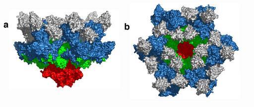 Keywords: P2-baseplate.tif en Crystal structure of the complex between phage p2 baseplate and Llama VHH5 domains Molecular surfaces represented laterally left and from the top right; top phage capsid direction Colors are as follows ORF 16 red; ORF15 green; ORF18 blue; VHH5 grey own Ccambillau Cc-zero Check categories 2011 March 16 en wikipedia Christian_Cambillau 2 Biologists from France 1951 births |
