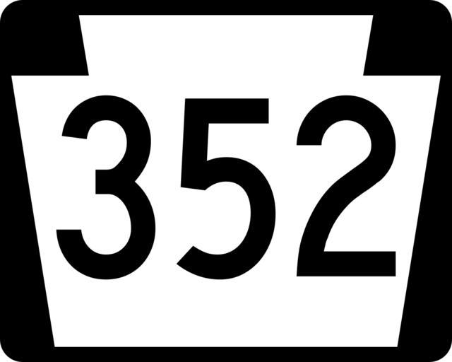 Keywords: PA-352.svg 750 mm by 600 mm 30 in by 24 in Pennsylvania shield made to the specifications of the Manual on Uniform Traffic Control Devices MUTCD 2003 Edition sign M1-5 Uses the Roadgeek 2005 fonts United States law does not permit the copyrighting of typeface designs and the fonts are meant to be copies of a U S Government-produced work anyway own 2006-07-26 TwinsMetsFan Public Domain Pennsylvania Route shields 352 Pennsylvania Route 352 |