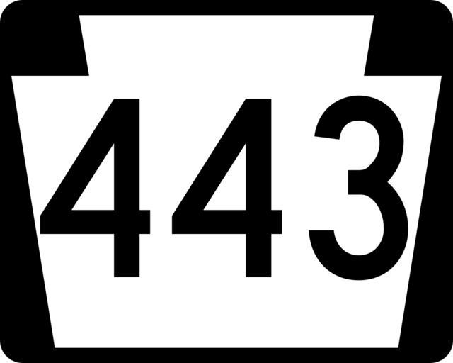 Keywords: PA-443.svg 750 mm by 600 mm 30 in by 24 in Pennsylvania shield made to the specifications of the Manual on Uniform Traffic Control Devices MUTCD 2003 Edition sign M1-5 Uses the Roadgeek 2005 fonts United States law does not permit the copyrighting of typeface designs and the fonts are meant to be copies of a U S Government-produced work anyway Own 2006-11-14 TwinsMetsFan Public Domain Pennsylvania Route shields 443 Pennsylvania Route 443 |