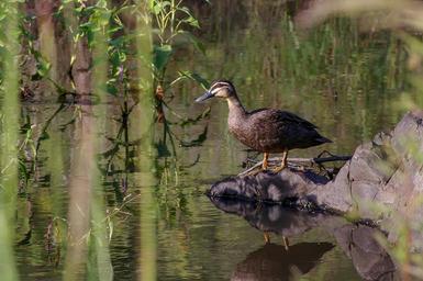 Keywords: pacific blue duck duck water rock standing bird black brown feathers wild queensland australia