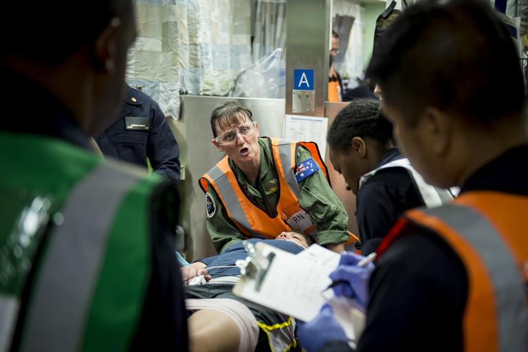 Keywords: Pacific Partnership 160624-N-QW941-155.jpg en 160624-N-QW941-155 PHILIPPINES SEA Squadron Leader Lynette Howell a nurse in the Royal Australian Air Force and native of Newcastle Australia communicates with personnel aboard hospital ship USNS Mercy during a mass casualty drill Deployed in support of Pacific Partnership 2016 medical engineering and various other personnel embarked aboard Mercy are working side-by-side with partner nation counterparts exchanging ideas building best practices and relationships to ensure preparedness should disaster strike <br>Unit Navy Media Content Services 2016-06-24 June 24 2016 https //www dvidshub net/image/2693378/pacific-partnership 160624-N-QW941-155 2016-06-28 00 15 PH PD-USGov-Military-Navy USNS Mercy T-AH-19 Pacific Partnership 2016 Images from DoD uploaded by Fæ |