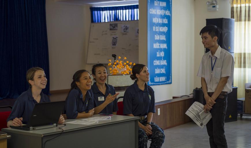 | Keywords: Pacific Partnership 160721-N-BB534-433.jpg en 160721-N-BB534-433 DA NANG Vietnam July 21 2016 Lt j g Naomi Harless left a dietician assigned to USNS Mercy T-AH 19 Michelle Tom a registered dietician with Project Hope Tiffany Loo a registered nurse with Project Hope and Lt Rebekah Kopesky a registered nurse assigned to Mercy present training about nutrition's effect on healing to hospital staff at Da Nang Orthopedics and Rehabilitation Hospital Members of Pacific Partnership 2016 visited the hospital for a subject matter expert exchange where they discussed nutritional management for patients recovering from surgery Mercy is joined in Da Nang by JS Shimokita LST-4002 and Vietnam People's Navy ship Khánh Hóa for Pacific Partnership Partner nations are working work side-by-side with local organizations to conduct cooperative health engagements community relation events and subject matter expert exchanges to better prepare for natural disaster or crisis U S Navy photo by Mass Communication Specialist 1st Class Elizabeth Merriam/Released <br>Unit Defense Imagery Management Operations Center 2016-07-21 Petty Officer 1st Class Elizabeth Merriam https //www dvidshub net/image/2741882/pacific-partnership 160721-N-BB534-433 2016-07-25 06 43 DA NANG VN PD-USGov-Military-Navy USNS Mercy T-AH-19 Pacific Partnership 2016 Images from DoD uploaded by Fæ |