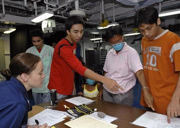 Keywords: Pacific Partnership 2007 DVIDS53110.jpg en Petty Officer 3rd Class Ashley Cameron a aviation ordnanceman and to two Filipino translators assist a Filipino patient during check in for medical care aboard amphibious assault ship USS Peleliu LHA 5 June 30 A group of Filipino patients arrived by helicopter aboard Peleliu for various medical treatments in support of Pacific Partnership 2007 In the long-standing Navy tradition of rendering assistance at sea from the sea Peleliu works with host nations and non-governmental organizations NGO's to offer medical care as well as to complete construction and engineering projects during Pacific Partnership 2007-06-30 Petty Officer 1st Class Bryan Ilyankoff https //www dvidshub net/image/53110 070630-N-+++++-020 2007-08-09 13 52 USS PELELIU AT SEA PD-USGov-Military-Navy Pacific Partnership 2007 USS Peleliu LHA-5 Images from DoD uploaded by Fæ |