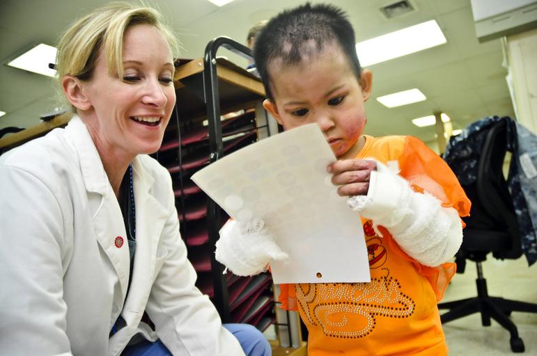 Keywords: Pacific Partnership 2012 in Vietnam 120713-N-ZZ999-046.jpg en U S Navy Cmdr Valerie Tokarz watches as a three-year-old Vietnamese burn victim looks at a page of stickers aboard the hospital ship USNS Mercy July 13 2012 in Vinh Vietnam during Pacific Partnership 2012 Tokarz performed scar reduction surgery on the girl to improve the child's appearance mobility and the dexterity of her limbs Pacific Partnership is an annual deployment of forces designed to strengthen maritime and humanitarian partnerships during disaster relief operations while providing humanitarian medical dental and engineering assistance to nations of the Pacific <br>Unit Defense Imagery Management Operations Center 2012-07-13 T-AH 19 https //www dvidshub net/image/626974/pacific-partnership-2012-vietnam 120713-N-ZZ999-046 2012-07-18 04 12 VINH CITY VN PD-USGov-Military-Navy USNS Mercy T-AH-19 Pacific Partnership 2012 Images from DoD uploaded by Fæ |