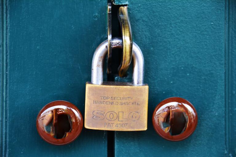 Keywords: pad lock shackle lock padlock security steel metal closed safe safety protect unlock protection home icon case hardened shut house building exterior door structure outdoor traditional secure gate door handle