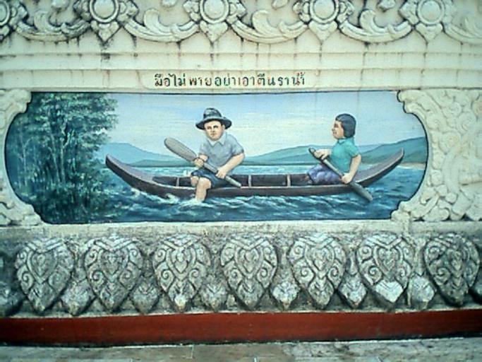 Keywords: Paddle.JPG มืà¸à¹„ม่พายà¸à¸¢à¹ˆà¸²à¹ à¸à¸²à¸•ีนราน้ำ มืà¸à¹„ม่พายà¸à¸¢à¹ˆà¸²à¹ à¸à¸²à¹ ท้าราน้ำ -- Illustrated Proverb Don't dangle foot when not paddling Phra That Phanom chedi Amphoe That Phanom Nakhon Phanom Province northeastern Thailand 2004-06-21 Pawyi Lee Public domain Reliefs in Thailand Wat Phra Tat Phanom Rowboats in art Human feet in art Proverbs in art Thai proverbs |