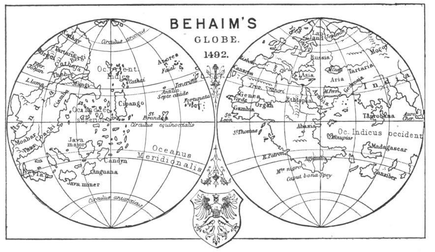 Keywords: Page 104 of Story of geographical discovery (Jacobs).png in that work states The Behaim Globe ”This gives the information about the world possessed in 1492 just as Columbus was starting and is mainly based upon the map of Toscanelli which served as his guide It will be observed that there is no other continent between Spain and Zipangu or Japan while the fabled islands of St Brandan and Antilia are represented bridging the expanse between the Azores and Japan Page 104 University of California Libraries at https //archive org/details/storyofgeographi00jacorich 1916 c1915 Unknown see text PD-old-70-1923 Maps from books Story of geographical discovery Maps of the world Toscanelli map |