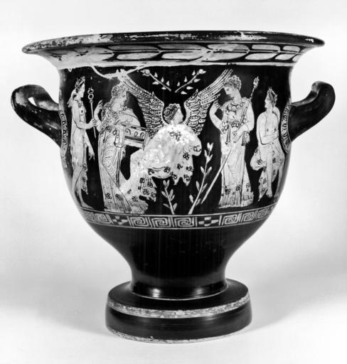 Keywords: Painter of Vienna 1089 - Red-Figure Bell Krater - Walters 4873 - Side A.jpg The light subject matter languid conventional poses and gestures and decorative detail are characteristic of the transitional period in vase painting A seated Eros in the center is flanked by two goddesses; on the right is probably his mother Aphrodite Hermes stands on the far left Eros's flesh was originally emphasized with white pigment now mostly lost The back shows a scene of youths with their sporting equipment early 4th century BC Classical terracotta cm 37 38 h x diam ; at handles cm 39 5 w accession number 48 73 23872 Don Marcello Massarenti Collection Rome cat no 171 Henry Walters city Baltimore Walters Art Museum Henry Walters Acquired by Henry Walters with the Massarenti Collection 1902 From Alexander to Cleopatra Greek Art of the Hellenistic Age The Walters Art Gallery Baltimore 1988-1989 Things With Wings Mythological Figures in Ancient Greek Art Ward Museum Salisbury 2009 place of origin Athens Greece Walters Art Museum license Ancient Greek red-figure pottery in the Walters Art Museum Painter of Vienna 1089 Media contributed by the Walters Art Museum needs category review Eros in ancient Greek pottery Hermes in ancient Greek pottery |
