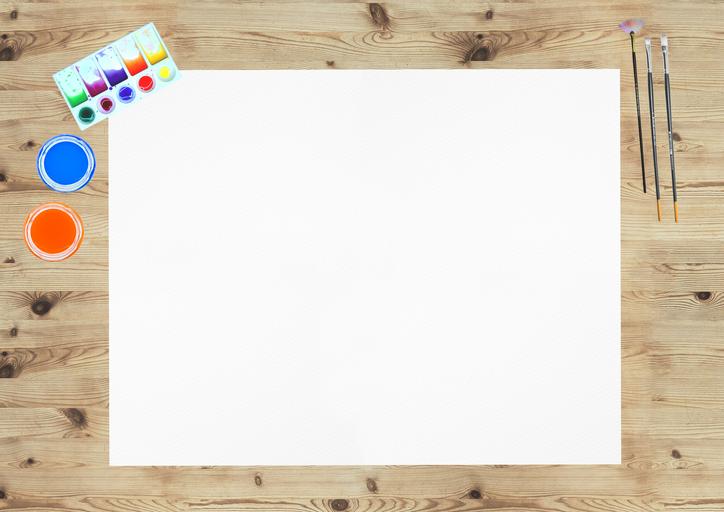 Keywords: paints brushes desk wooden paper blank empty space art create creative template watercolours