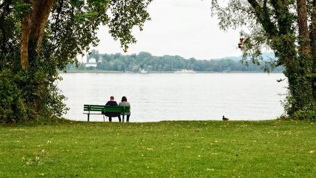 Keywords: pair water bank lake mood romantic together man woman holiday recovery enjoy nature chiemsee out relax landscape rest sit scenic