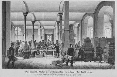 Keywords: Paket- und Zeitunspostamt Leipzig Paketsortier- bzw. Verlesesaal (Die Gartenlaube (1881), S. 412).jpg de Das kaiserliche Paket- und Zeitungspostamt in Leipzig am Johannisplatz / Prager Straße 4-10 Höhe Grassimuseum eröffnet am 16 Oktober 1880 Innenansicht Paketsortiersaal Verlesesaal im Erdgeschoss des Hauptgebäudes Stich von Hermann Heubner in Die Gartenlaube 1881 S 412 1881 Die Gartenlaube 1881 S 411-413 Hermann Heubner other versions PD-old-70-1923 Hermann Heubner Johannisplatz Leipzig Paket- und Zeitungspostamt Leipzig Johannisplatz/Prager Straße |