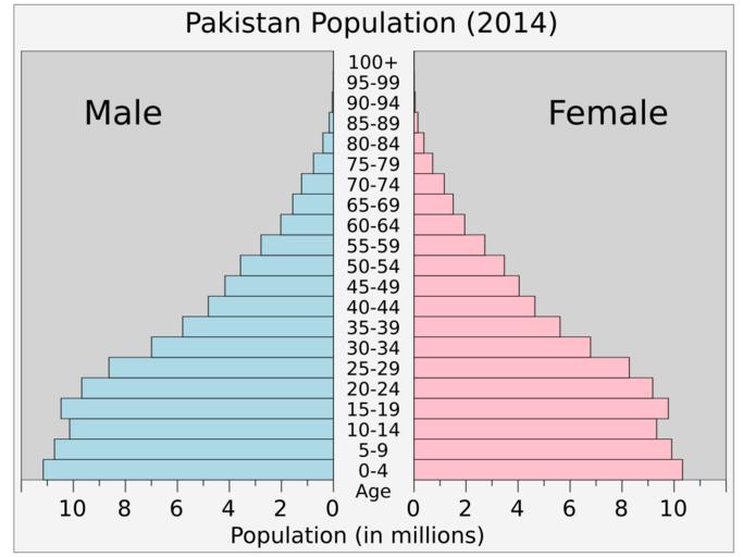 Keywords: Pakistanpop.svg translate yes en Current population pyramid of Pakistan 2014 from UN estimates World Population Prospects http //esa un org/unpd/wpp/Excel-Data/population htm The 2012 Revision 2014-08-29 own Delphi234 cc-zero Uploaded with UploadWizard Population pyramids of Pakistan |