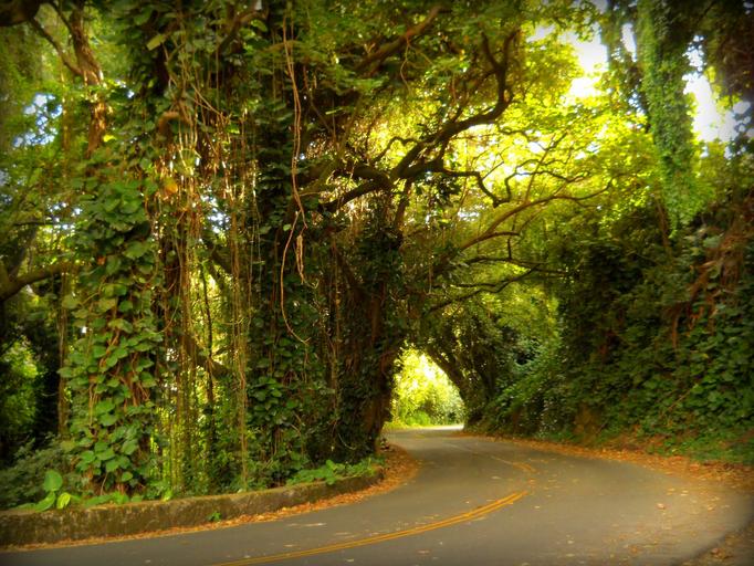Keywords: pali road curve nuuanu rainforest hawaii nature green tropical forest trees