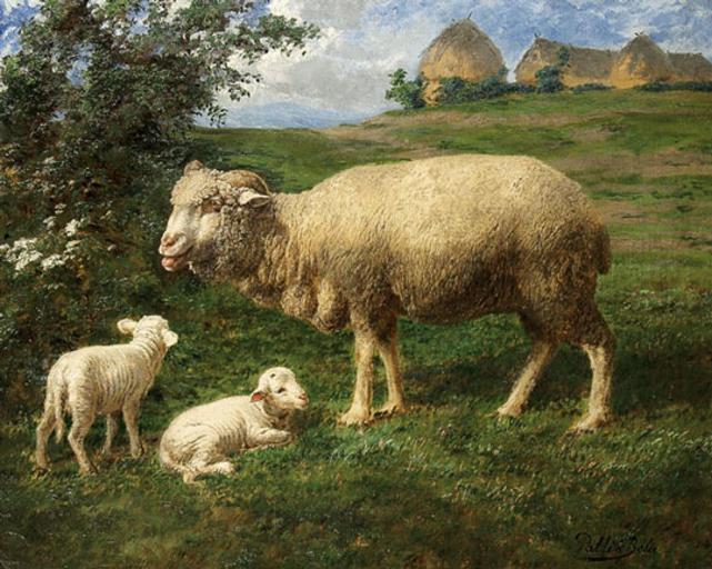 Keywords: Pállik Bárányok.jpg Lambs Oil on canvas cm 56 68 Private collection accession number object history credit line http //www nagyhazi hu/tetelek_tobb php id 11 tid 2618 tp 20 page 0 Nagyházi Galéria és Aukciósház PD-old Paintings by Béla Pállik Paintings of sheep |