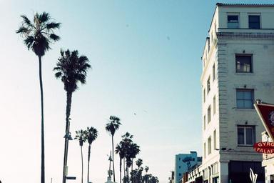 Keywords: palm trees sunshine sunny summer blue sky buildings city gyro falafel