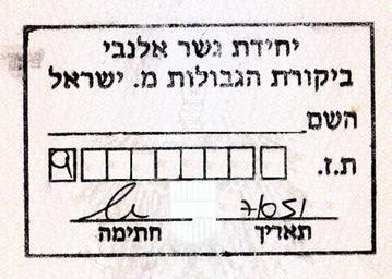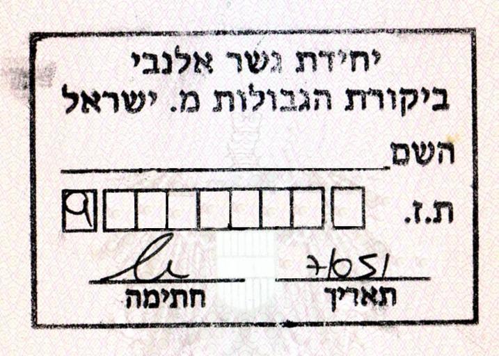 Keywords: Palpassport mark.jpg en Stamp with I D No put by Israel border authority in new foreign passports of Palestinians de Stempel mit der ID-Nummer den Palästinenser von Israel in ihren neuen ausländischen Pass erhalten Grenzstation Allenby-Brücke darunter der Name unten die Nummer own Abutoum 2011-10-26 Cc-zero Passport stamps of Israel Allenby Bridge |