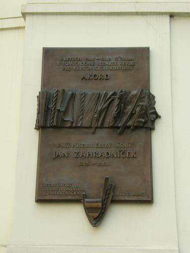 Keywords: Pametni deska na zdejsi pusobeni J. Zahradnicka.JPG Pametni deska na zdejsi pusobeni J Zahradnicka Silingrovo namesti v Brne own 2008-04-17 Lukáš Malý uvolňuji dílo Plaques in Brno Jan Zahradníček Šilingrovo náměstí Brno