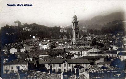 Keywords: Vista ripresa da Giubiano del centro cittadino. Al centro dell'immagine, a sinistra del campanile di San Vittore, la sagoma isolata di villa Molinari-Craven-Seyssel d'Aix (arch. Giuseppe Antonio Bianchi, seconda metà del XVIII sec.), oggi la vegetazione inibisce completamente la visione dell'edificio. A destra sulla cima del colle Campigli l'imponente sagoma del Grand Hotel Palace. varese |