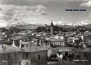 Keywords: Immagine ripresa da Giubiano. In basso a sinistra la stazione delle Ferrovie dello Stato (1865), più sopra si vede palazzo Sciarini (arch. Aldo Scala e ing. Antonino Mazzoni, 1930-33) con l'ultimo piano non ancora terminato. A destra del campanile della chiesa di San Vittore è visibile la torre degli apparati scenici del Teatro Civico. varese |