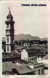 Keywords: Vista sul campanile ed il tiburio di San Vittore (entrambe opere dell' arch. Giuseppe Bernasconi). In secondo piano, a destra del tiburio, villa Mylius sul colle Miogni. In primo piano destra, l'edificio multipiano era l'antico palazzo arcivescovile (citato per la prima volta nel 1179) costruito dietro il battistero di San Giovanni Battista, abbattuto negli anni '60 per realizzare la sede di un istituto bancario (la ex Banca Popolare di Luino e di Varese). varese |