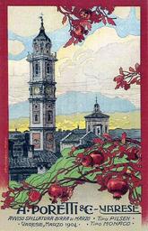 Keywords: Locandina pubblicitaria raffigurante il campanile ed il tiburio di San Vittore (entrambe opere dell' arch. Giuseppe Bernasconi). varese