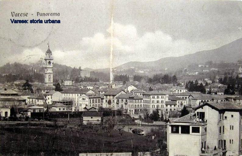 Keywords: Immagine ripresa da Giubiano. Al centro il binario terminale, occupato da un lungo treno, della stazione delle Ferrovie dello Stato. Dietro palazzi della via Morosini ancora in costruzione, all'estrema destra l'inconfondibile cupola del Politeama. A destra del campanile di San Vittore, sul colle Campigli, la sagoma solitaria ed imponente di villa Molinari-Craven-Seyssel d'Aix (arch. Giuseppe Antonio Bianchi, seconda metà del XVIII sec.), oggi la vegetazione inibisce completamente la visione dell'edificio. varese |