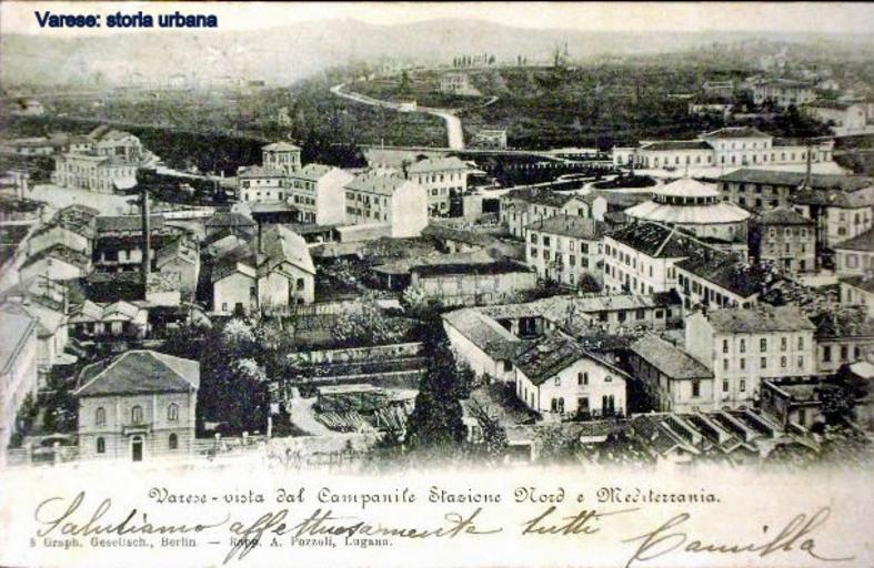 Keywords: In primo piano via Cavour con ampie aree non urbanizzate, anche via Morosini è solo parzialmente costruita. Dietro il terrapieno dei binari della ferrovia per Porto Ceresio, via Maspero si inerpica per il colle di Giubiano privo di costruzioni e coperto di ronchi, sulla cima il cimitero monumentale dove spiccano i cipressi e la ciminiera del crematorio. varese |
