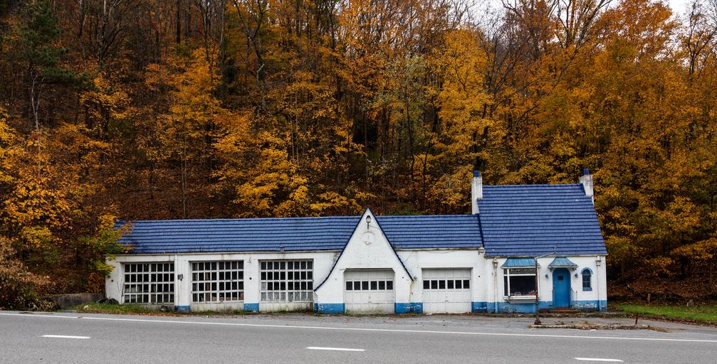 Keywords: panorama pure oil gas station old abandoned closed autumn fall vintage antique landmark historic historical west virginia forest woods trees