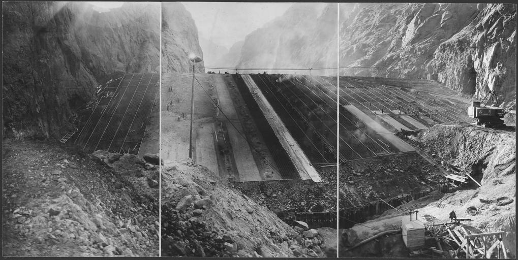 | Keywords: Panorama of upstream face of upstream cofferdam. Crest of fill at maximum elevation 720. Concrete surface in progress - NARA - 293790.jpg Scope and content Photograph from Volume Two of a series of photo albums documenting the construction of Hoover Dam Boulder City Nevada General notes Original image measures approximately 14 inches in width 293790 Local identifier Department of the Interior Bureau of Reclamation Engineering and Research Center 05/18/1981 - 03/04/1988 NARA's Rocky Mountain Region Denver NRGA Building 48 Denver Federal Center West 6th Avenue and Kipling Street Denver CO 80225-0307 1933-01-06 Record group Record Group 115 Records of the Bureau of Reclamation 1889 - 2008 Record group ARC 444 Photograph albums compiled 1903 - 1972 Series ARC 293611 File unit File unit ARC Variant control numbers NAIL Control Number NRG-115-CONSTPHO85006-BC21502TO1504 Other versions <gallery> File Panorama of upstream face of upstream cofferdam Crest of fill at maximum elevation 720 Concrete surface in progress - NARA - 293790 tif tif </gallery> NARA-cooperation PD-USGov Construction of the Hoover Dam |