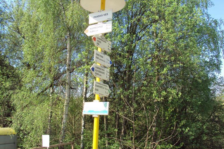 Keywords: Panská ves 3.jpg cs Rozcestník na návsi vesnice Panská ves katastr Nedamov Dubá own Zákupák 2011-04-24 50 31 40 244 N 14 33 54 125 E region CZ Panská Ves Hiking and footpath fingerposts in Dubá